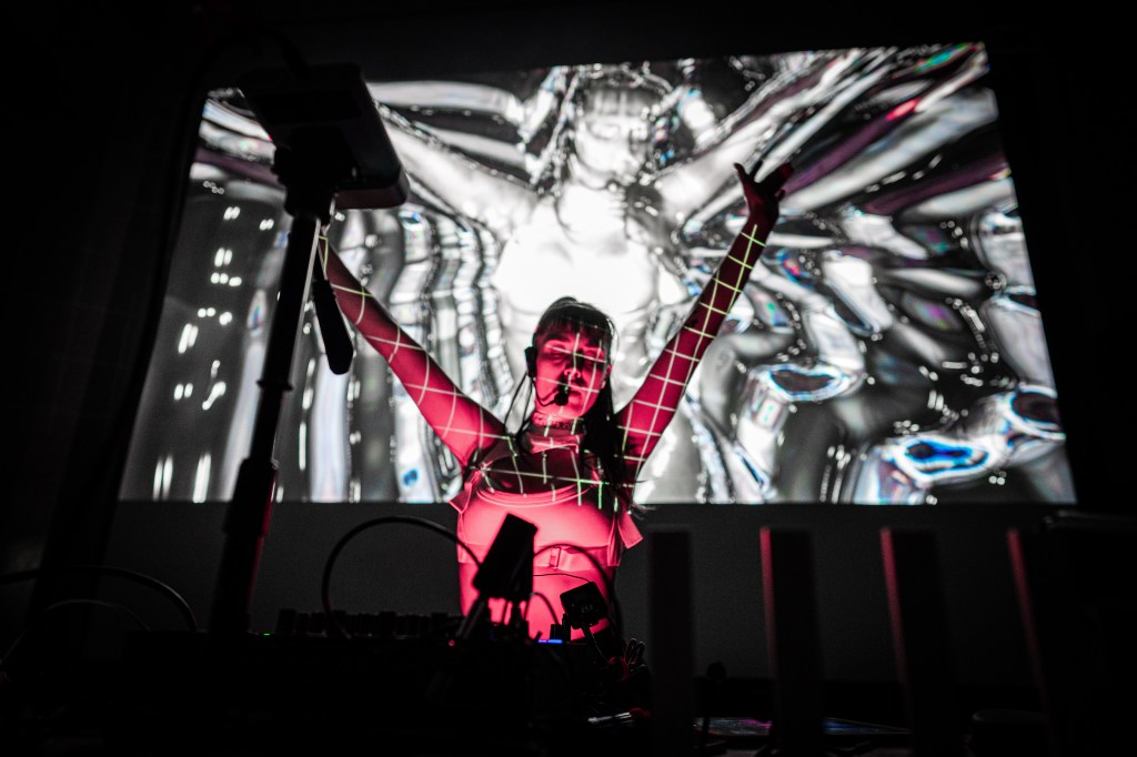 The duo’s work is characterized by a blend of liquid metal creatures and grotesque sci-fi aesthetics, accompanied by a fusion of footwork, baile funk, and techno. The integration of generative art in their performance allows for a dynamic interaction between the artists and their visual projections, creating a constantly evolving spectacle that blurs the line between performer and environment.