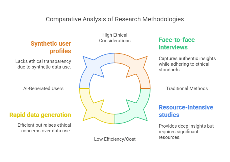 Although AI-generated users offer potential efficiency gains, the long-term drawbacks in authenticity, ethical standards, and flexibility often render them less effective as standalone research tools.